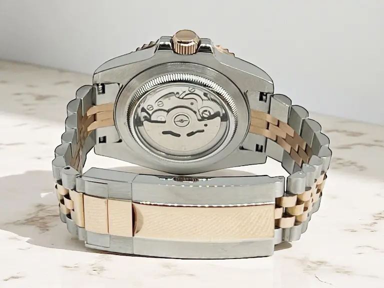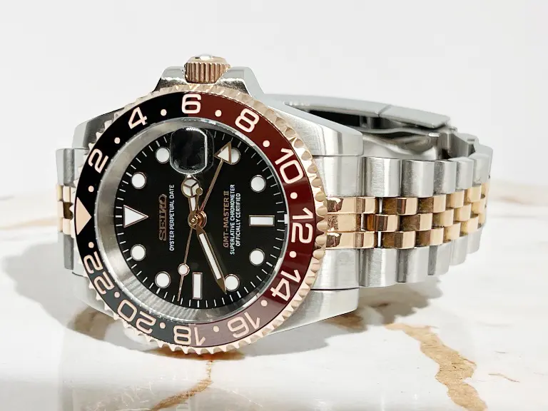 Hier erwartet Sie ein sorgfältig zusammengestellter Seiko Mod GMT-MASTER 2 ROOT BEER rosé-gold, der aus hochwertigen Modding-Parts und Seiko NH34 Uhrwerk gefertigt wurde. Dieses Modell ist ein Ausdruck kreativer Ideen und handwerklicher Präzision von Custom Watch Mod.